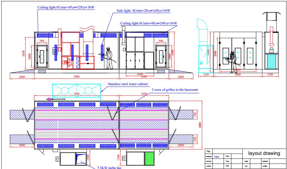 | Front door (2 sets) | Folding door, 3folds, 3000×2600 mm (W×H), one on the front side (share with the spray booth, as the lighting box, the height less than 2.6m a little), another one on the back side, without frame, aluminium alloy window frame, colour: Blue | |||||||